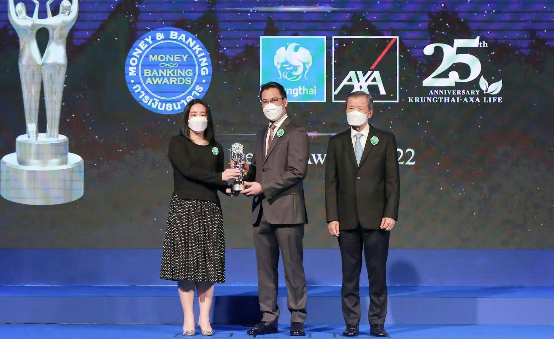 Dr.Sethaput Suthiwartnarueput, Governor of the Bank of Thailand presided over the ceremony and honored to present the prestigious Money & Banking Awards 2022 to Ms. Sukanya Isranuwatchai, SVP-Head of Brand & Communications of Krungthai-AXA Life Insurance to receive the Great Design Awards, from the 22nd Money Expo 2022, which the company received the award for 2 consecutive years.