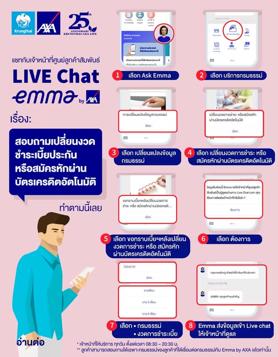 ** Emma chatbot จะให้บริการข้อมูลกรมธรรม์เบื้องต้นก่อนทุกครั้ง หลังจากนั้นจะส่งต่อให้เจ้าหน้าที่ศูนย์ลูกค้าสัมพันธ์ผ่าน Live Chat ต่อไป