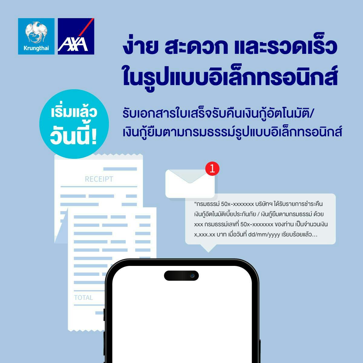 เริ่มแล้ววันนี้ บริการรูปแบบใหม่ให้การรับใบเสร็จรับคืนเงินกู้อัตโนมัติ/เงินกู้ยืมตามกรมธรรม์เป็นเรื่องง่าย สะดวก และรวดเร็วในรูปแบบอิเล็กทรอนิกส์