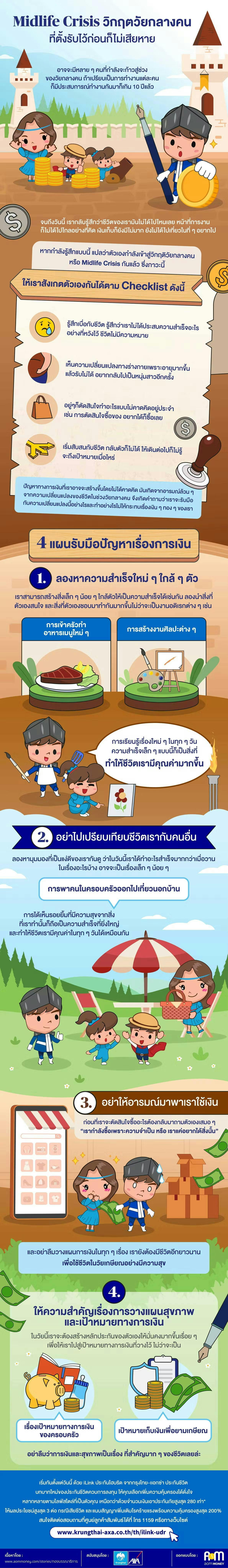 อย่างที่อัศวินเล่าให้ฟังในตอนต้นว่า ในช่วงภาวะวัยกลางคนหลายๆคนอาจจะใช้อารมณ์ไปกับการซื้อของต่าง ๆ เพื่อสร้างความสำเร็จที่จับต้องได้ เพราะฉะนั้นแล้วก่อนที่เราจะตัดสินใจซื้ออะไรต้องกลับมาถามตัวเองเสมอ ๆ นะครับว่า “เรากำลังซื้อเพราะความจำเป็น หรือ เราแค่อยากได้สิ่งนั้น” และอย่าลืมวางแผนการเงินในทุก ๆ เรื่องนะครับ เรายังต้องมีชีวิตอีกยาวนาน เพื่อใช้ชีวิตในวัยเกษียณอย่างมีความสุข