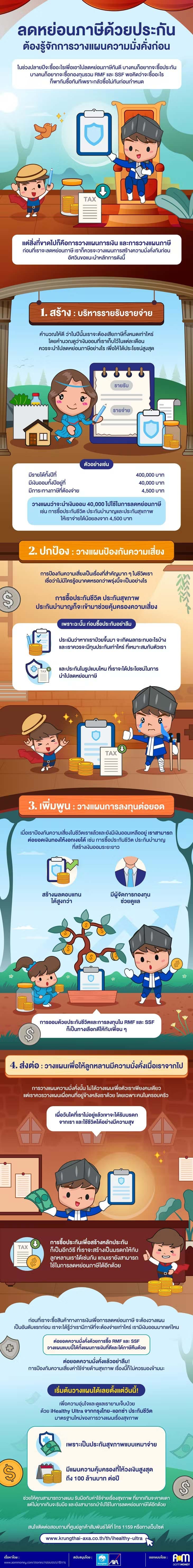 การซื้อประกันชีวิต ประกันสุขภาพ ประกันบำนาญก็จะเข้ามาช่วยคุ้มครองความเสี่ยงตรงนี้ เพราะฉะนั้นแล้วก่อนซื้อประกันอย่าลืมประเมินดูนะครับว่าหากเราป่วยขึ้นมาจะเกิดผลกระทบอะไรบ้างและเราควรจะมีทุนประกันเท่าไหร่ที่เหมาะสมกับตัวเรา และประกันในรูปแบบไหนที่เราจะได้ประโยชน์ในการนำไปลดหย่อนภาษีครับ