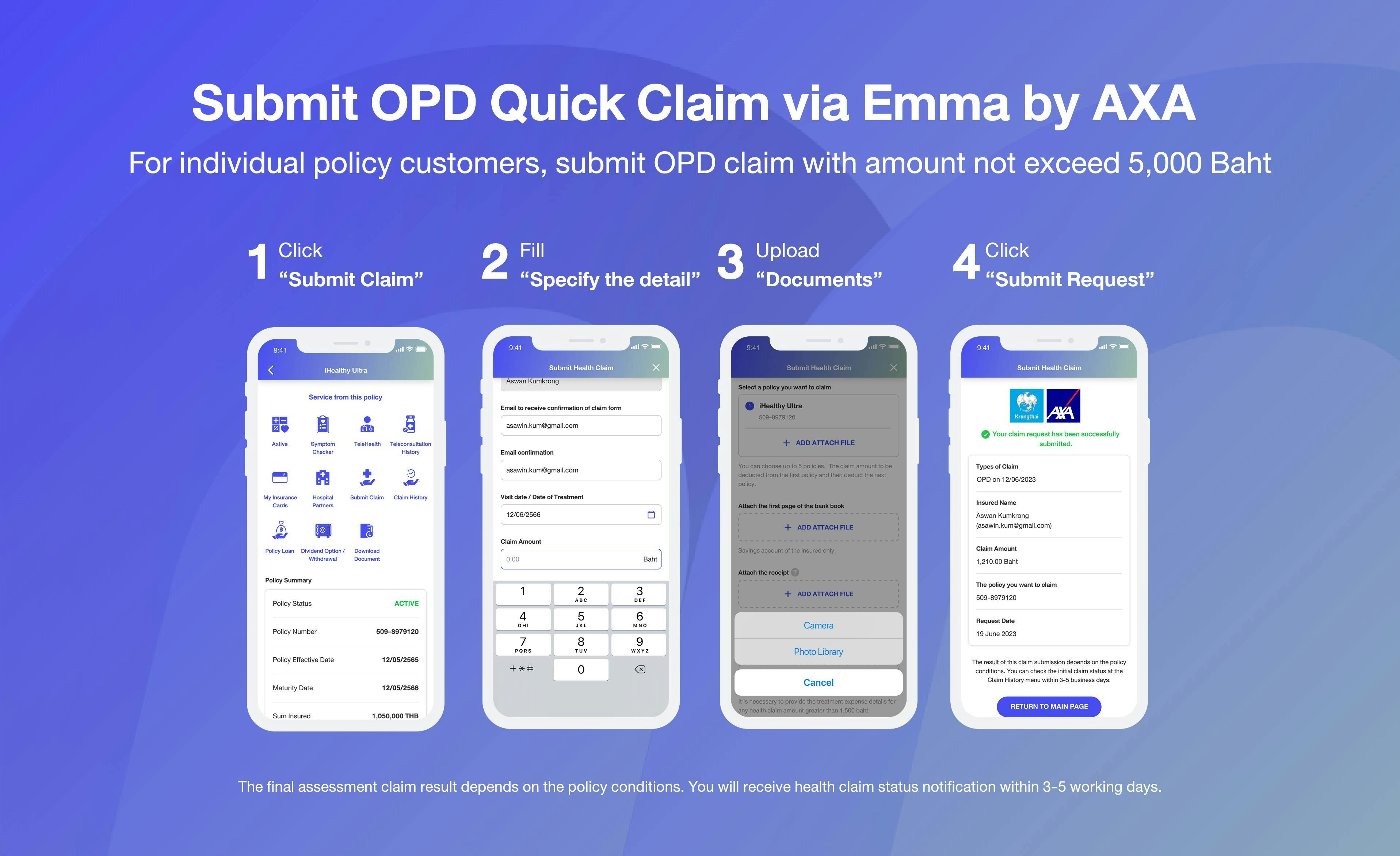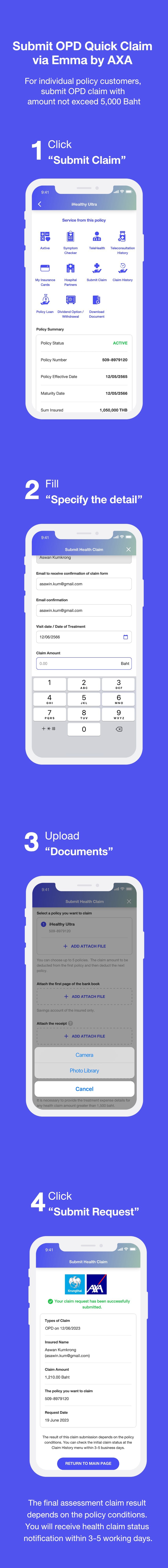 A new service for Krungthai-AXA Life Insurance PCL, customers who have made advance the payment of Outpatient Department (OPD) treatment expenses can easily submit OPD Quick Claim via Emma by AXA * Hospital Benefit, IPD treatment expenses, Personal Accident Policy, critical illnesses, and death claim, and Group Insurance Policy, have not yet been supported.