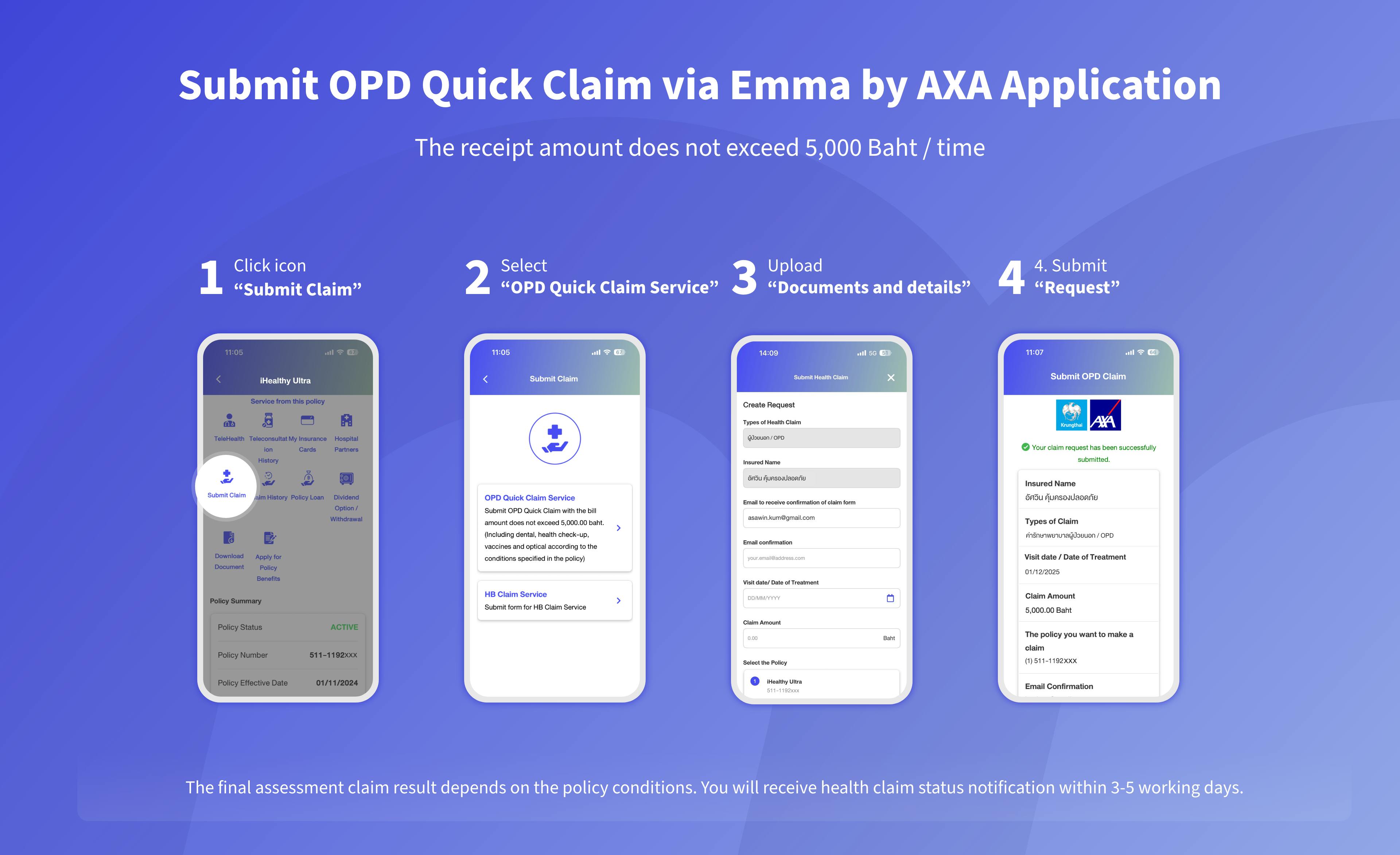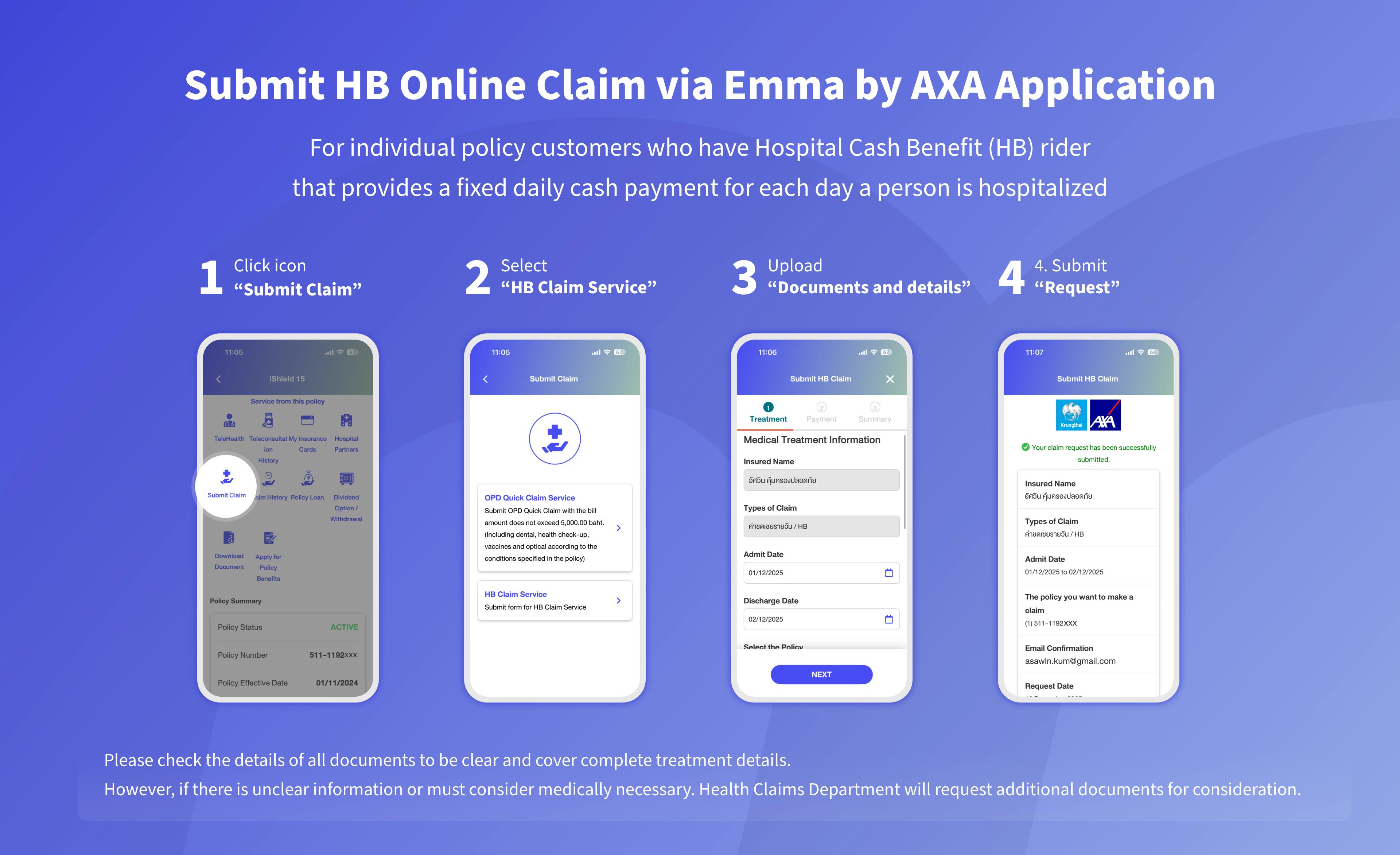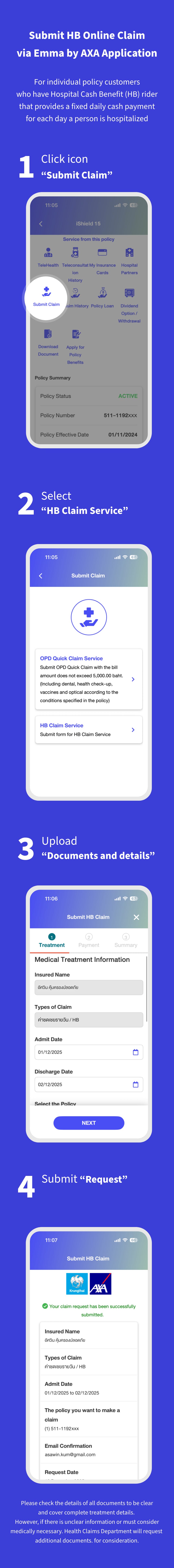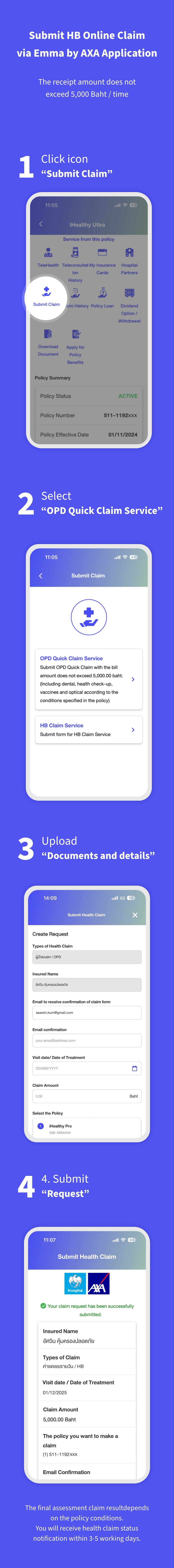 Customers can easily submit claims online by themselves. Just prepare the documents and submit documents online through the Emma by AXA application.