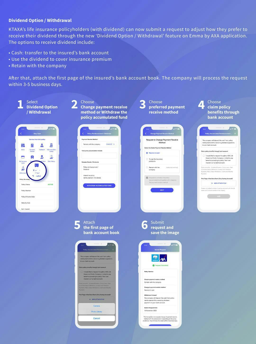 Emma by AXA, your digital assistant, has constantly developed new features to meet and accommodate our valuable customer expectations. Krungthai-AXA Life Insurance customers who are eligible a life insurance policyholder (dividend option) can submit a request choosing how to receive and withdraw dividend via Emma by AXA application