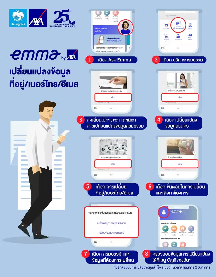 เพียงมี Emma by AXA การเปลี่ยนแปลงข้อมูล ที่อยู่/เบอร์โทร/อีเมล กรมธรรม์ก็สามารถทำด้วยตัวเองได้ง่ายๆ ตามขั้นตอนดังนี้เลย