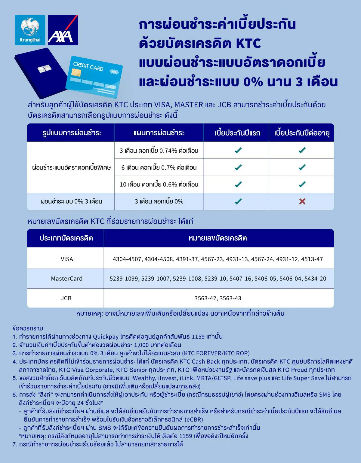 สำหรับลูกค้าผู้ใช้บัตรเครดิต KTC ประเภท VISA, MASTER และ JCB สามารถชำระค่าเบี้ยประกันด้วยบัตรเครดิตสามารถเลือกรูปแบบการผ่อนชำระได้