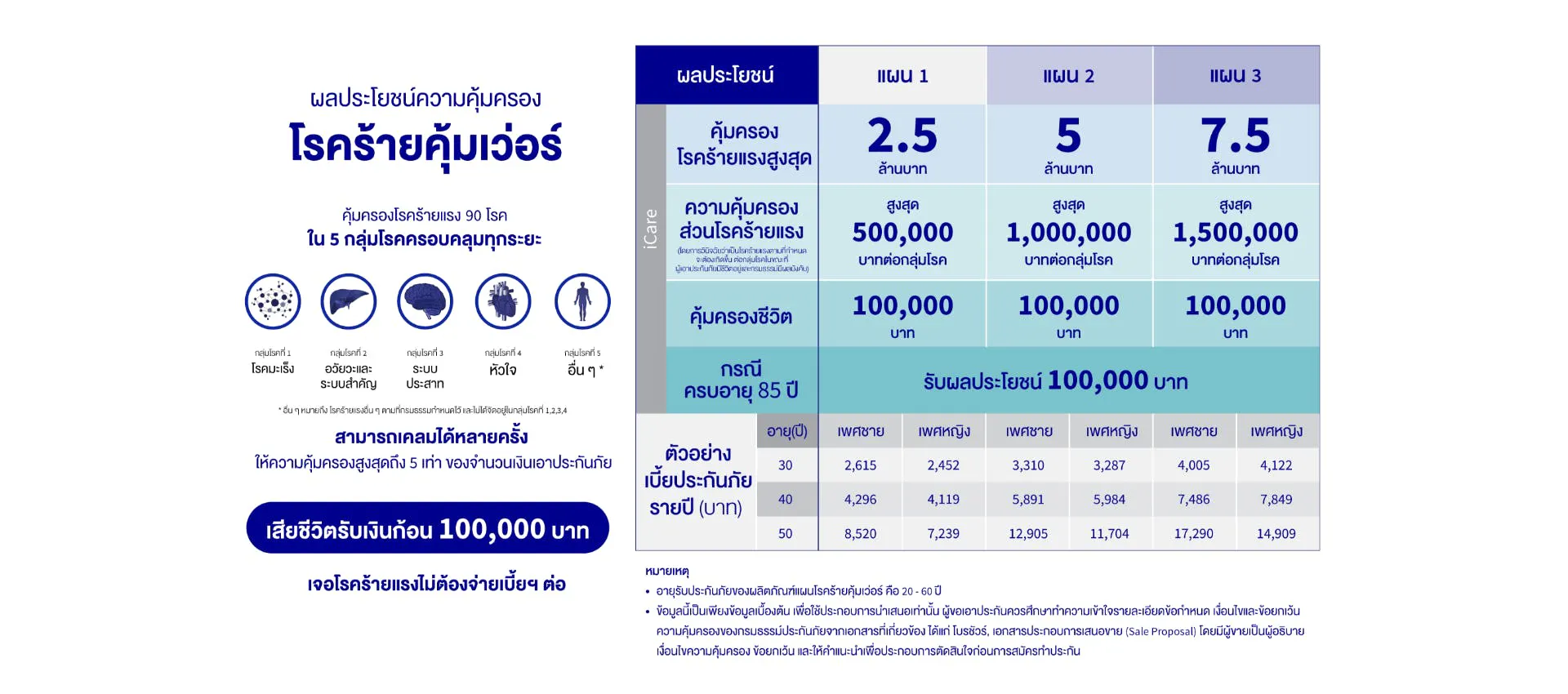 "เพราะโรคร้า่ยค่าใช้จ่ายสูง เตรียมความพร้อมวางแผนวันนี้กับ โรคร้ายคุ้มเวอร์ ให้ความคุ้มครองเมื่อตรวจพบโรคร้าย 5 กลุ่มโรค ให้คุณต่อสู้กับโรคร้ายได้หลายครั้ง คุ้มครองสูงสุด 7.5 ล้านบาท"