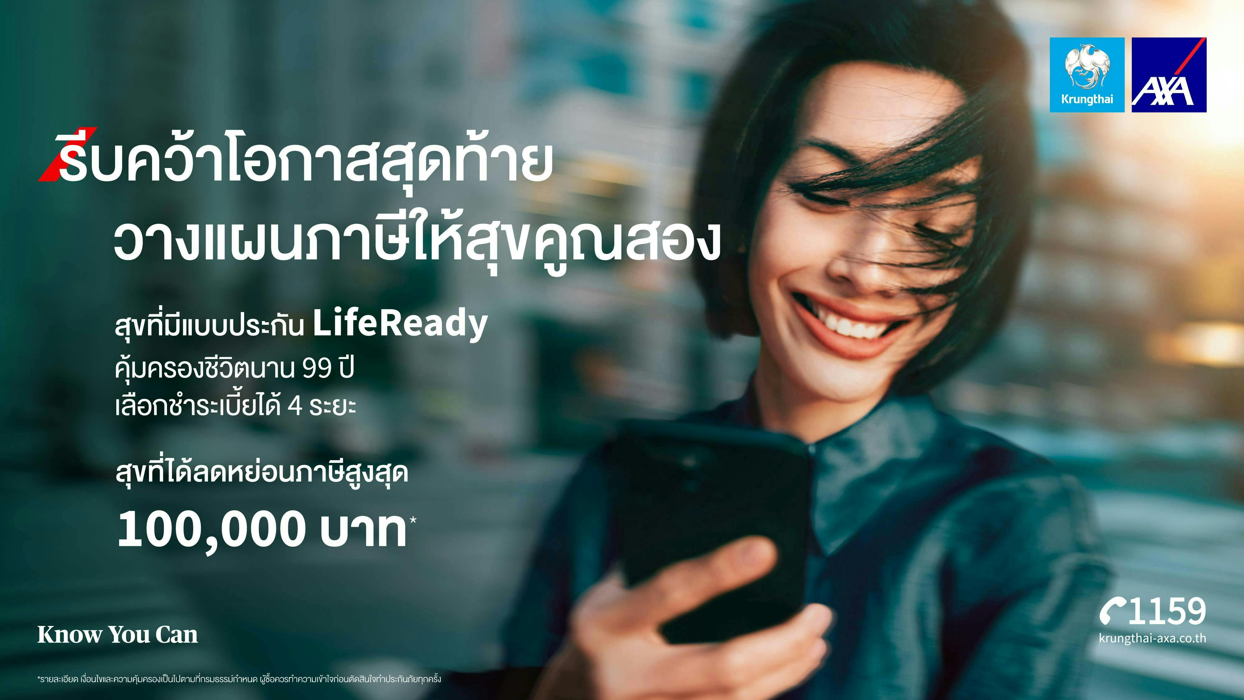 สุขที่มีแบบประกัน Life Ready สุขที่ได้ลดหย่อนภาษีสุงสุด 100,000 บาทให้ความคุ้มครองชีวิตสูง นานถึงอายุ 99 ปี เลือกจ่ายเบี้ยสั้น-ยาวได้ตามใจ ทั้ง 6 ปี 12 ปี 18 ปี หรือตลอดสัญญา เบี้ยประกันภัยสามารถลดหย่อนภาษีได้สูงสุดถึง 100,000 บาท คลิกดูรายละเอียด