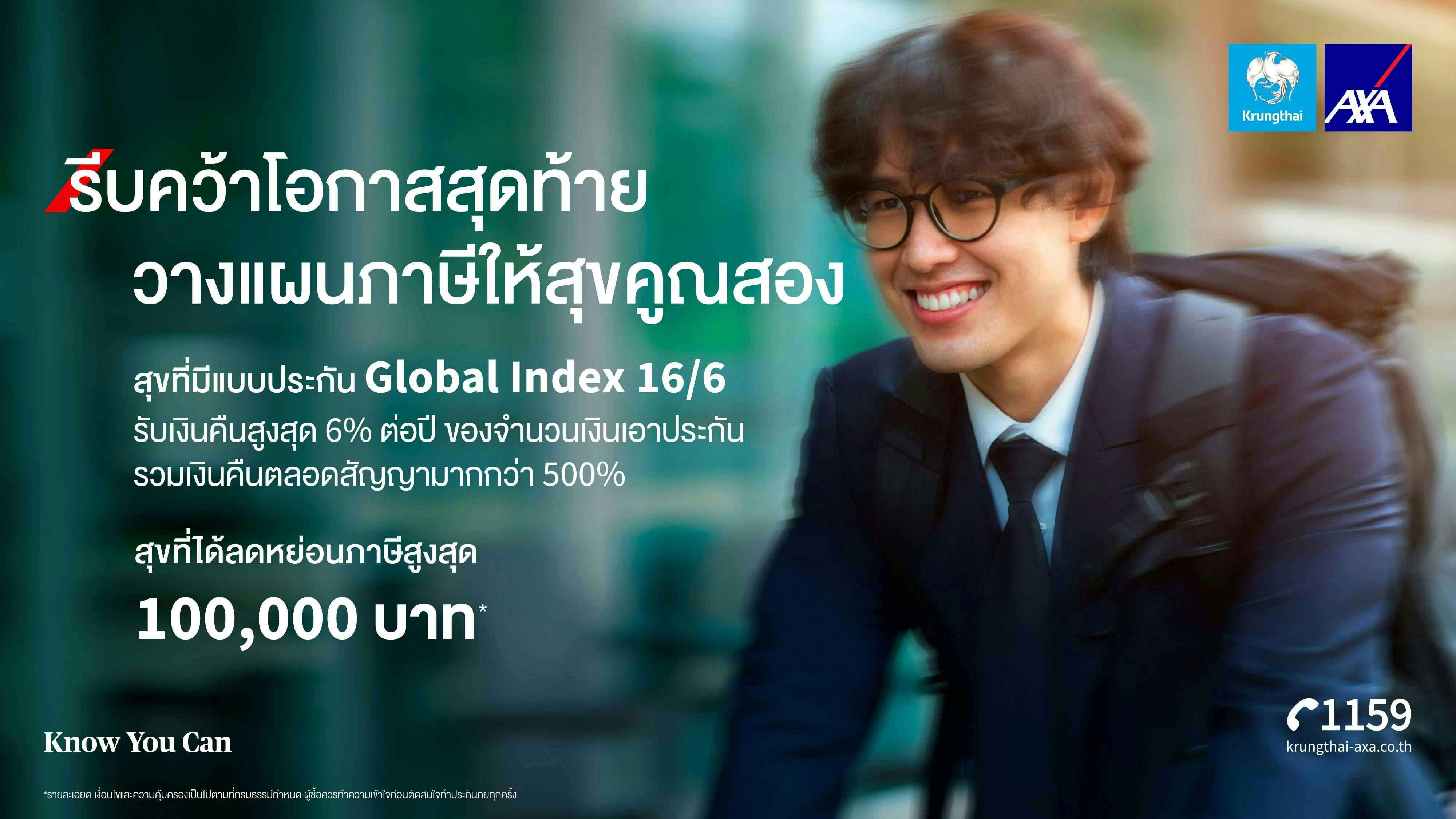 สุขที่มีแบบประกัน Global Index 16/6 สุขที่ได้ลดหย่อนภาษีสุงสุด 100,000 บาทจ่ายเบี้ยฯ สั้นวางแผนง่าย รับเงินคืนทุกปี ไปตลอดจนครบกำหนดสัญญา ความคุ้มครองสูงตั้งแต่วันแรก เบี้ยประกันภัยสามารถลดหย่อนภาษีได้สูงสุดถึง 100,000 บาท คลิกดูรายละเอียด