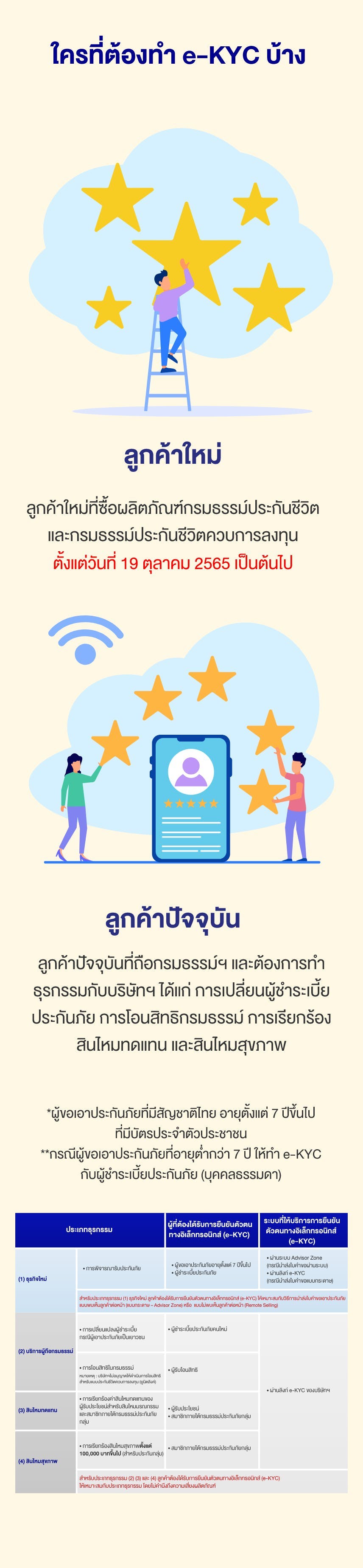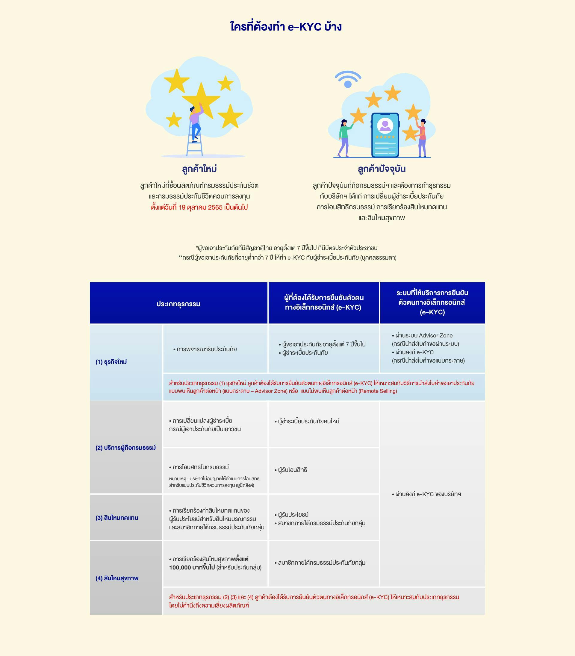 • สำหรับลูกค้าใหม่ สามารถติดต่อ บริษัทฯและสำนักงานสาขา หรือตัวแทนประกันชีวิตของท่าน เพื่อยืนยันตัวตนในการทำประกันผ่านระบบการขาย Advisor Zone