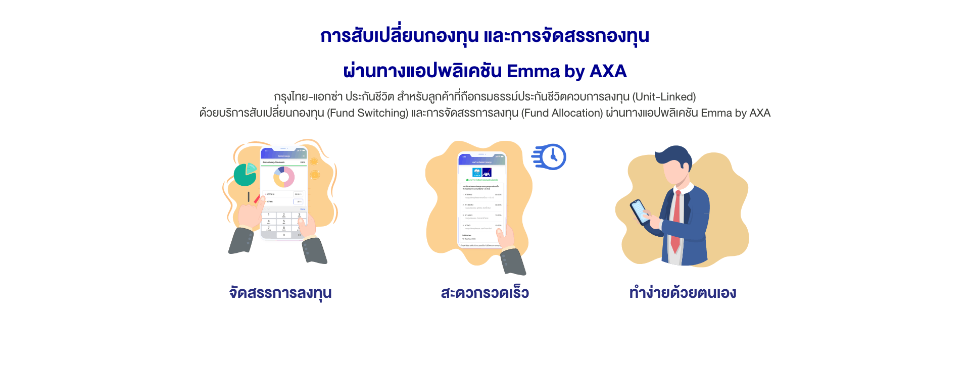 กรุงไทย-แอกซ่า ประกันชีวิต ได้พัฒนาแอปพลิเคชัน Emma by AXA อย่างต่อเนื่อง เพื่อให้ลูกค้าคนพิเศษได้รับบริการที่สะดวกและครอบคลุมในทุกกลุ่มผลิตภัณฑ์ สำหรับลูกค้าที่ถือกรมธรรม์ประกันชีวิตควบการลงทุน (Unit-Linked) ขอแนะนำบริการ ได้แก่ บริการสับเปลี่ยนกองทุน (Fund Switching) การจัดสรรการลงทุน (Fund Allocation) และการถอนเงินบางส่วนจากกรมธรรม์ (Partial Withdrawal) โดยเลือกทำรายการได้ด้วยตัวเอง ผ่านทางแอปพลิเคชัน Emma by AXA