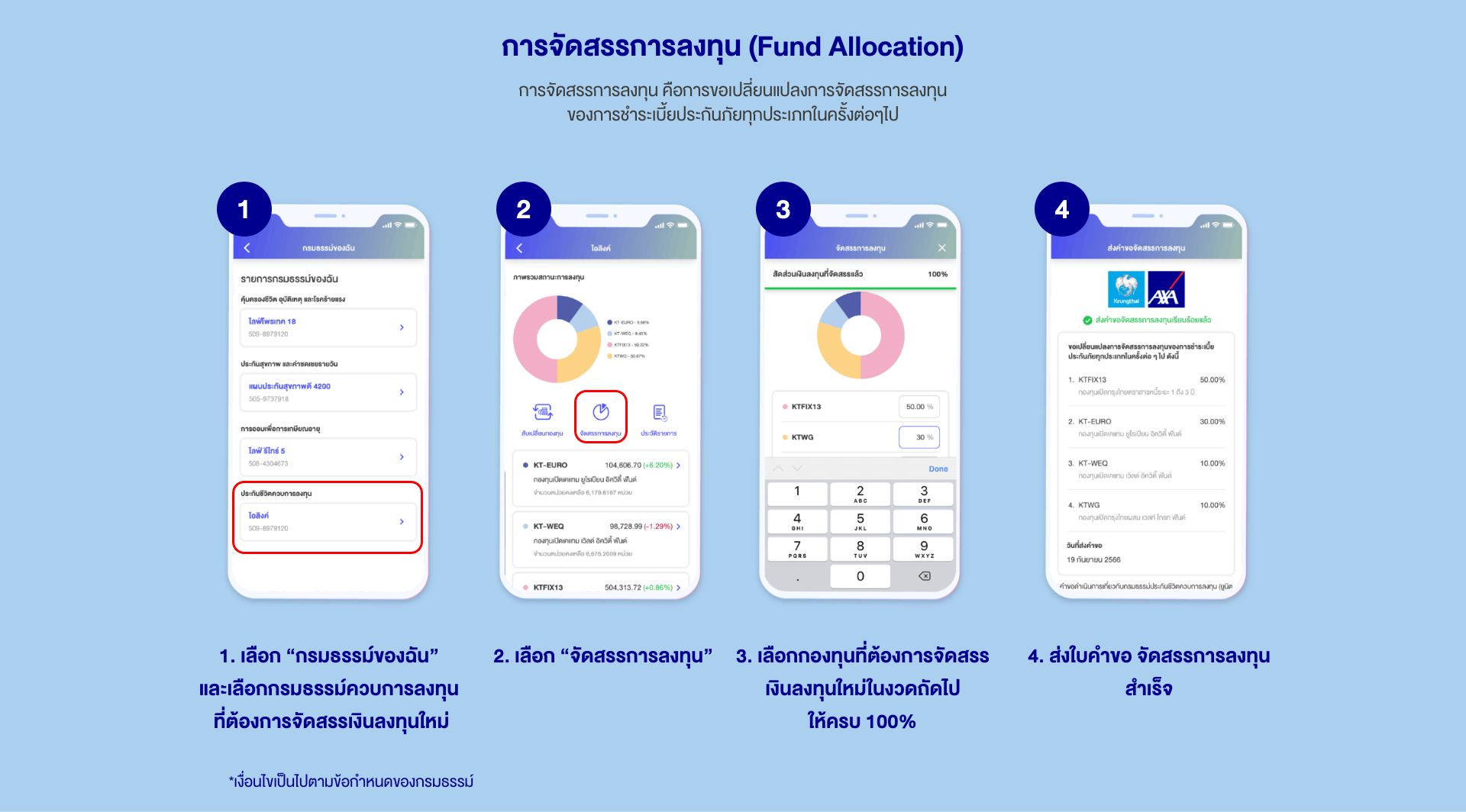 4.2 จัดสรรการลงทุนสำหรับเบี้ยประกันภัยเพื่อการลงทุนเพิ่มเติมพิเศษ เป็นการเฉพาะสำหรับการชำระเบี้ยประกันภัยครั้งนี้เท่านั้น