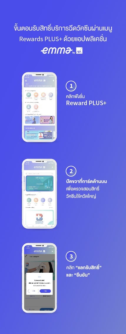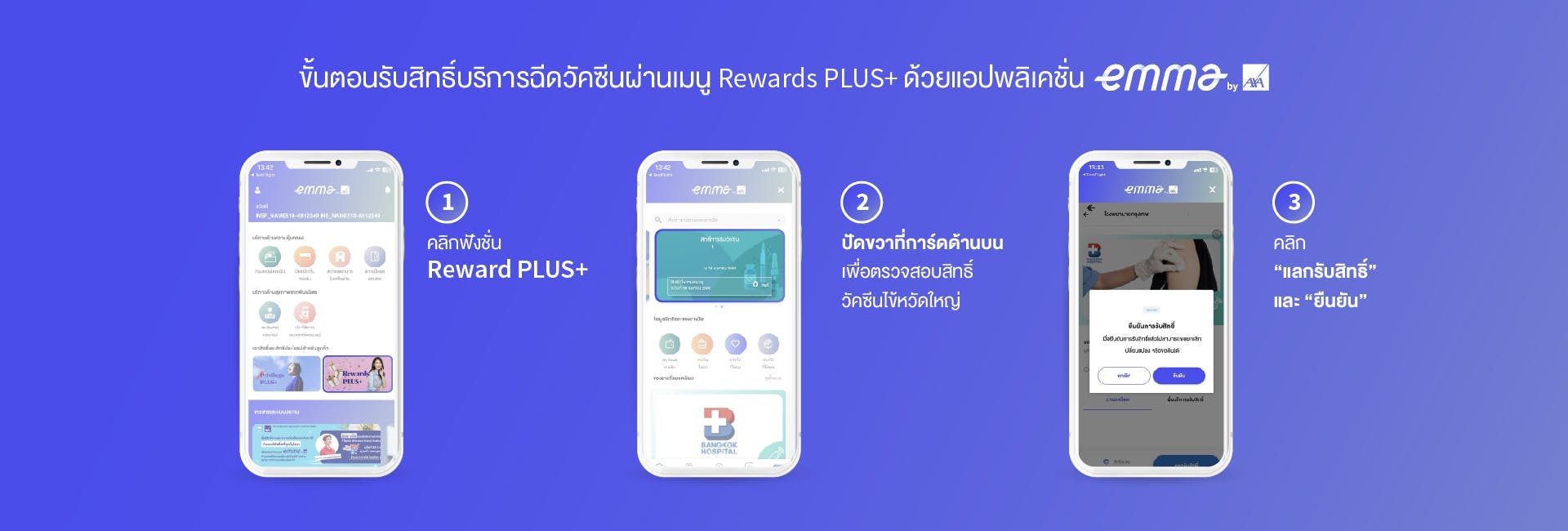 - ผู้ถือกรมธรรม์ประกันสุขภาพรายบุคคล อายุ 6 เดือนขึ้นไป ที่กรมธรรม์มีผลบังคับ ณ วันที่ 20 เมษายน 2568 โดยกดรับสิทธิได้ตั้งแต่ วันที่ 1 พฤษภาคม – 31 กรกฎาคม 2568 ผ่านแอบพลิเคชัน Emma by AXA และผ่านเมนู “Rewards PLUS+” และเข้ารับบริการฉีดวัคซีนกับโรงพยาบาลที่เข้าร่วมโครงการ โดยผู้เอาประกันภัยจะต้องแสดงรหัสที่ได้รับ (Redemption Code) จาก Rewards PLUS+ บนแอบพลิเคชัน Emma by AXA พร้อมทั้งบัตรประกันสุขภาพของกรุงไทย-แอกซ่า ประกันชีวิต หรือบัตรประชาชนของผู้เอาประกันได้ที่เคาน์เตอร์โรงพยาบาล
