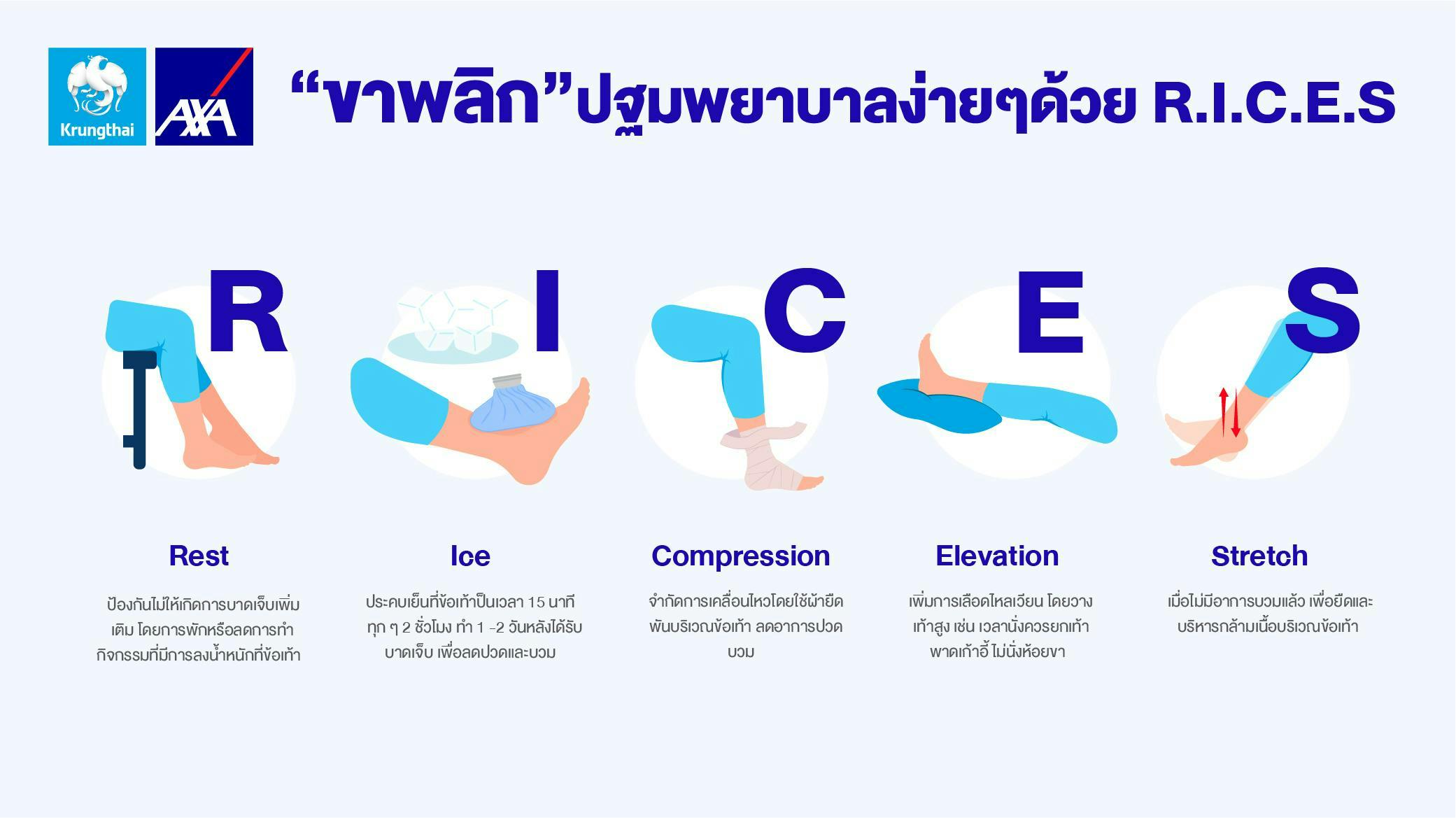 หากท่านมีอาการข้อเท้าพลิก สามารถทำตามขั้นตอนดังกล่าว เพื่อช่วยบรรเทาการบาดเจ็บเบื้องต้นได้ ในกรณีที่ปฐมพยาบาลเบื้องต้นแล้วอาการเหล่านี้ไม่ดีขึ้น เช่น ข้อเท้ายังมีอาการบวมมาก หรือเมื่อลงน้ำหนักที่เท้าแล้วรู้สึกปวด แสดงว่ากระดูกข้อเท้าอาจแตกหรือหัก จึงควรเข้ารับการวินิจฉัยจากแพทย์เพิ่มเติมได้ที่โรงพยาบาลหรือคลินิกใกล้บ้าน สำหรับลูกค้ากรุงไทย-แอกซ่าประกันชีวิต สามารถดูรายละเอียดการบริการด้านสุขภาพ (KTAXA Health) เพิ่มเติมได้ที่ https://www.krungthai-axa.co.th/th/HealthServices