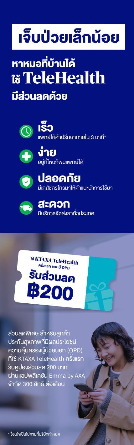 - บริการ TeleHealth ไม่เหมาะกับกรณีเจ็บป่วยฉุกเฉินที่ต้องการการรักษาทางการแพทย์เร่งด่วน เช่น ถ้าลูกค้ามีอาการเจ็บหน้าอก หายใจไม่สะดวก หรือ เกิดอุบัติเหตุ ลูกค้าควรไปพบแพทย์ที่โรงพยาบาลทันที