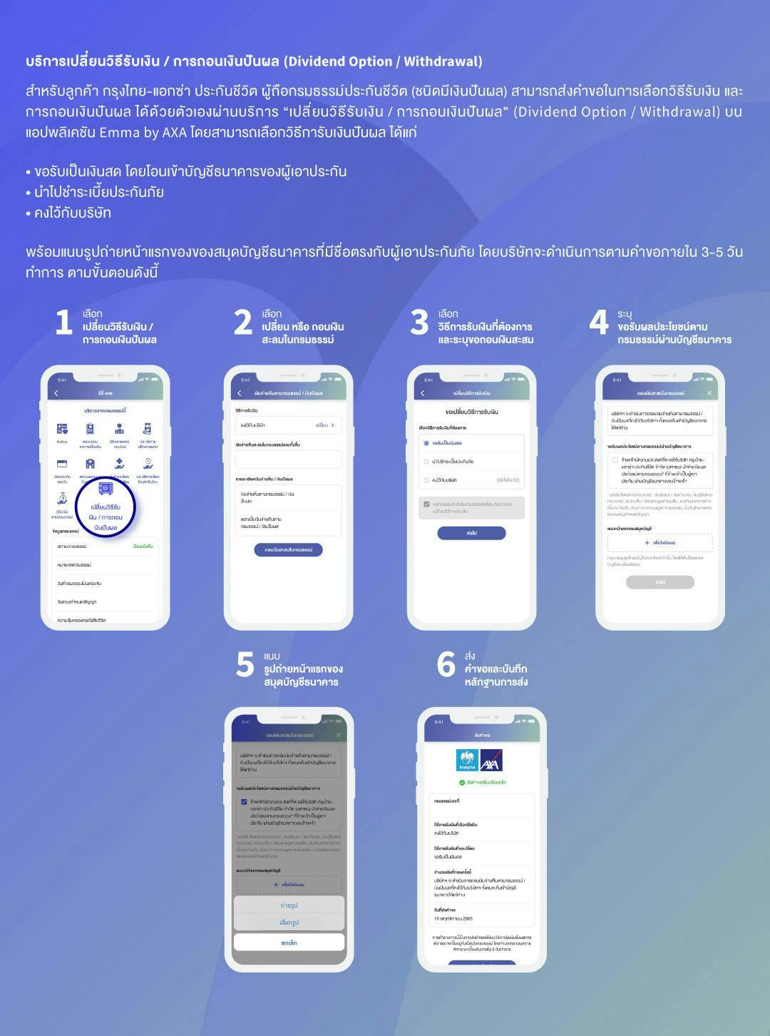 Emma by AXA ซึ่งเป็น ผู้ช่วยส่วนตัวดิจิทัล ได้พัฒนาฟีเจอร์ใหม่อย่างสม่ำเสมอให้สอดคล้องตามความต้องการของลูกค้า และอำนวยความสะดวกให้กับของลูกค้าคนสำคัญ สำหรับลูกค้ากรุงไทย-แอกซ่า ประกันชีวิต ผู้ถือกรมธรรม์ประกันชีวิต (ชนิดมีเงินปันผล) สามารถส่งคำขอ เพื่อเลือกวิธีรับเงิน และการถอนเงินปันผลได้ด้วยตัวเองผ่านแอปพลิเคชัน Emma by AXA