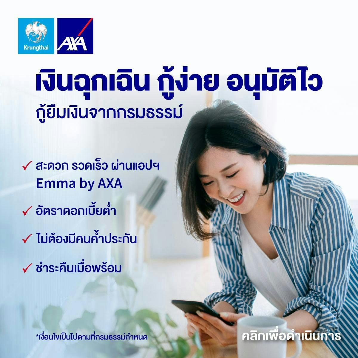 ไม่ว่าใครก็เกิดวิกฤติในชีวิตได้ ทั้งเรื่องการเงินหรือเหตุการณ์ไม่คาดฝันที่ทำให้หลายสิ่งไม่เป็นไปตามแผน กรุงไทย-แอกซ่า ประกันชีวิต พร้อมห่วงใย และเคียงข้างคุณทุกสถานการณ์ ด้วยบริการกู้ยืมเงินตามกรมธรรม์ (e-Policy Loan) ผ่านแอปพลิเคชัน Emma by AXA ที่จะช่วยเพิ่มความคล่องตัวในทุกค่าใช้จ่าย ให้คุณใช้ชีวิตได้อย่างสบายใจ โดยที่ท่านยังได้รับความคุ้มครองจากกรมธรรม์ประกันชีวิตตามปกติ