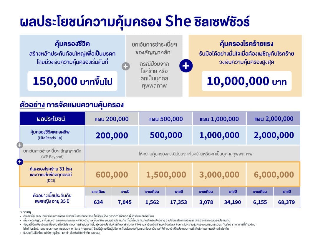 กำลังโหลดข้อมูล...ด้วยบทบาทหน้าที่สำคัญที่ต้องดูแลคนในครอบครัว นอกเหนือถาระค่าใช้จ่ายในบ้าน คุณอาจจะต้องคำนึงถึงการวางแผนเพื่อสร้างหลักประกัน และความมั่นคงให้กับพวกเขาอีกด้วย แต่ด้วยแผนประกัน She ชิลเซฟชัวร์ ที่ออกแบบมาเพื่อช่วยเปลี่ยนเรื่องที่ยุ่งยากของคุณให้กลายเป็นเรื่องง่ายๆ ทิ้งความกังวลใจและโฟกัสกับหน้าที่ของคุณได้อย่างเต็มที่ และเติมเต็มรอยยิ้มให้กับครอบครัวได้ในทุกๆ วัน